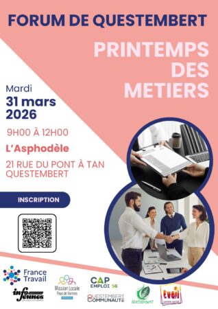Le premier forum du printemps des métiers se tiendra le mardi 31 mars de 9h à 12h à l’Asphodèle (Questembert). Cet événement est une occasion unique de découvrir des entreprises et des métiers et d’explorer des opportunités d’emploi.